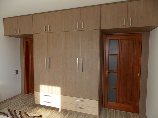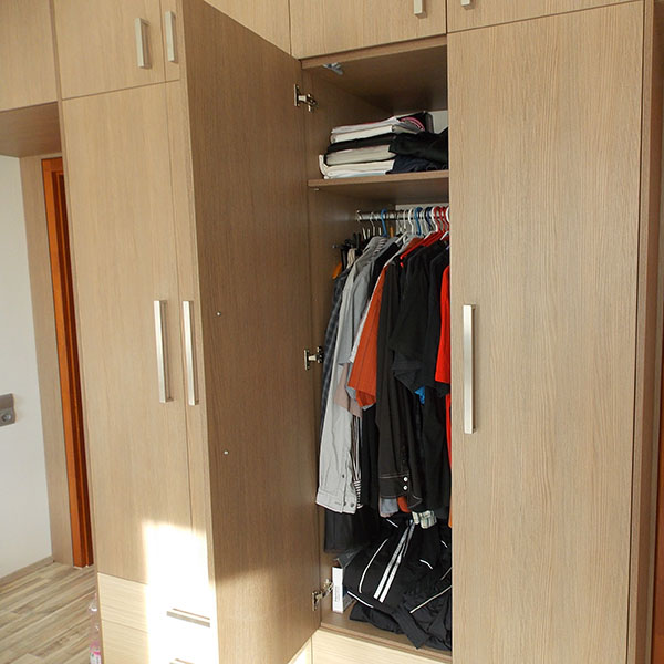 Beépített szekrény teljesen a mennyezetig építve nyíló ajtókkal.