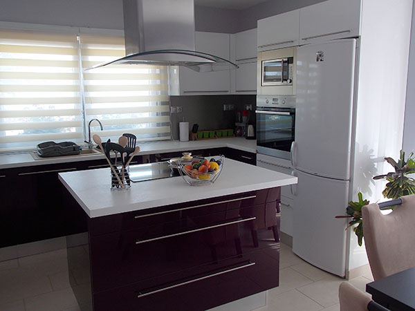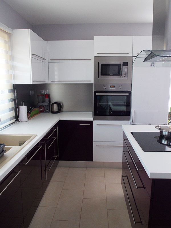 Magasfényű konyhabútor lila és fehér színekkel